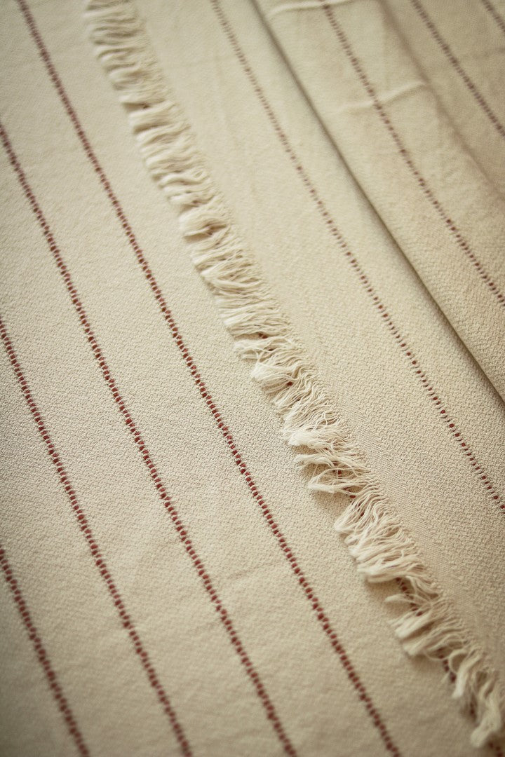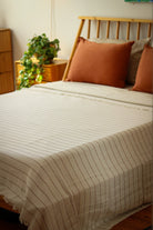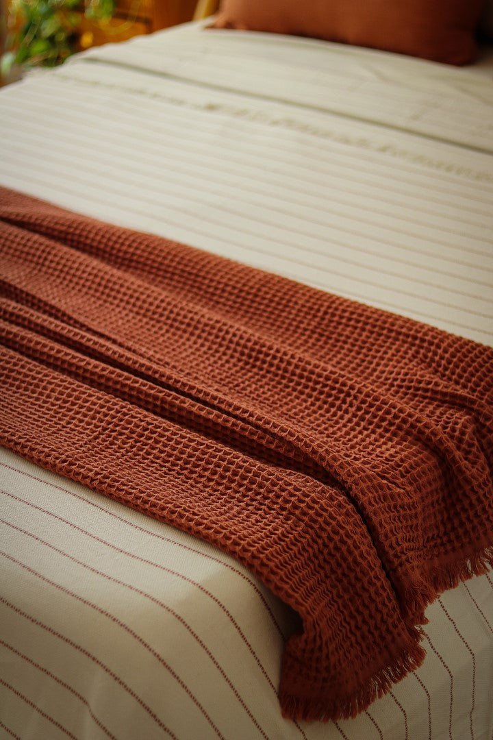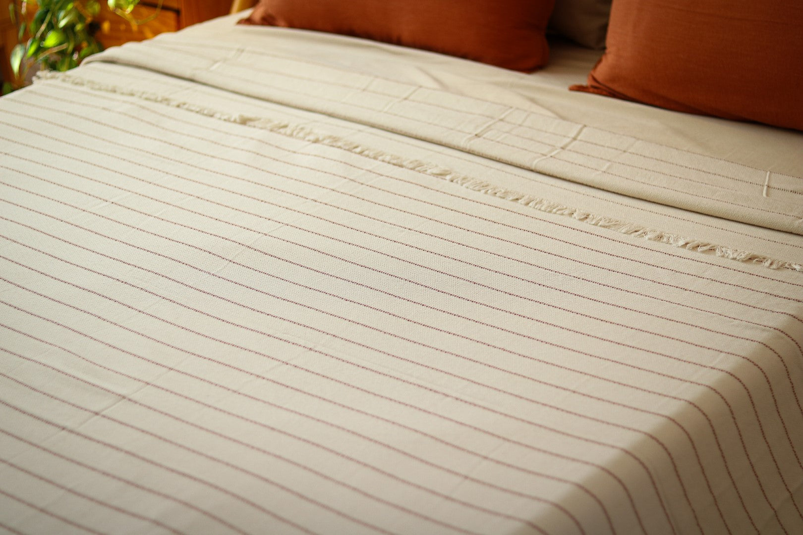 Crafted from 100% natural cotton, this generously sized bed cover brings an effortless sense of calm to any space. Lightly textured with fine woven stripes and finished with soft fringed edges, it’s designed to layer beautifully — across your bed, sofa, or a sunlit terrace.
