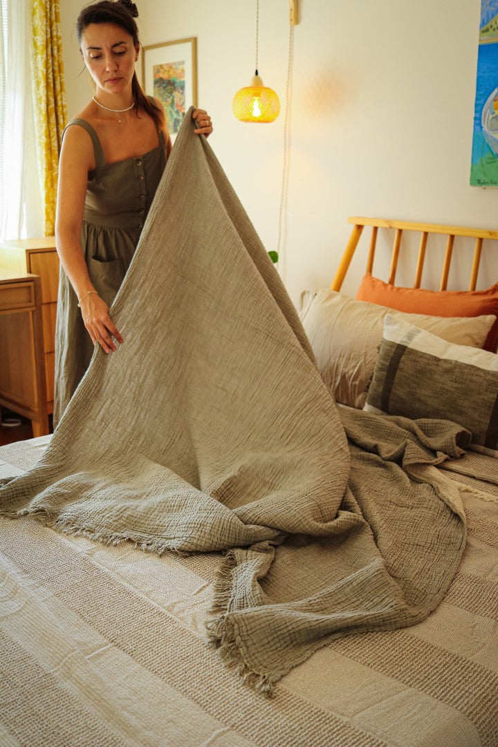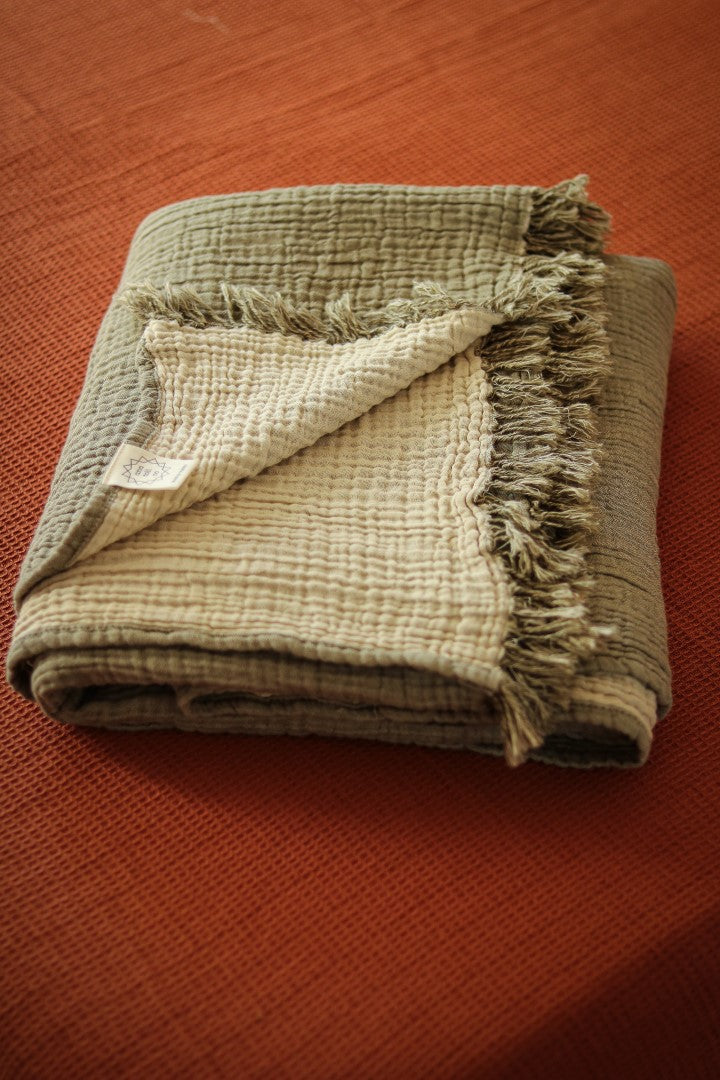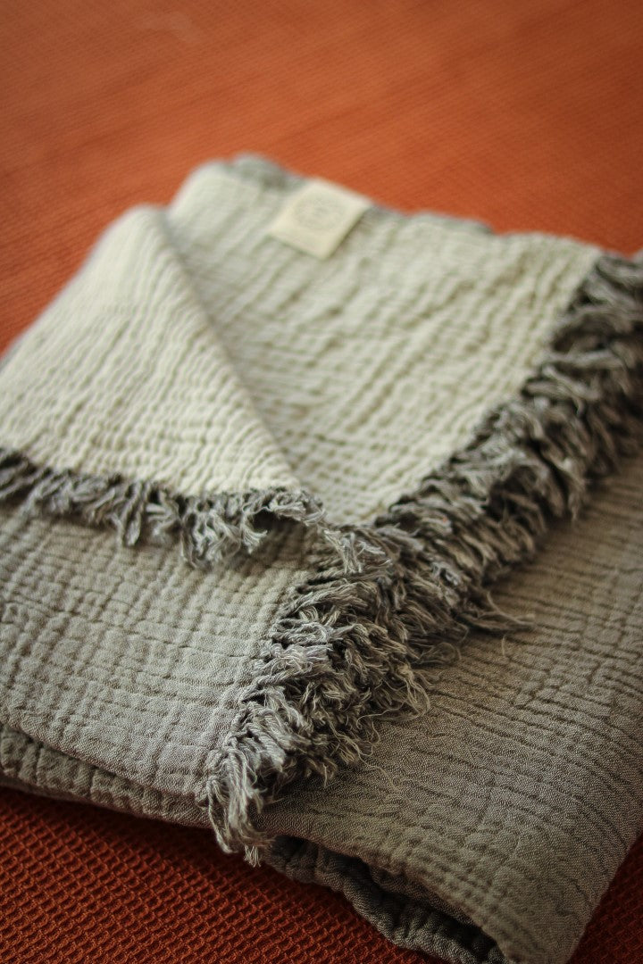 This versatile throw features a stunning reversible design: one side showcases a rich, muted mountain-green/sage, while the reverse is a soft, creamy natural ecru. This allows you to effortlessly shift the mood of your space with a simple flip. Its airy weight and generous drape make it the perfect companion for an afternoon nap, a decorative accent on your favorite chair, or an extra layer of soft warmth over your main bedding.