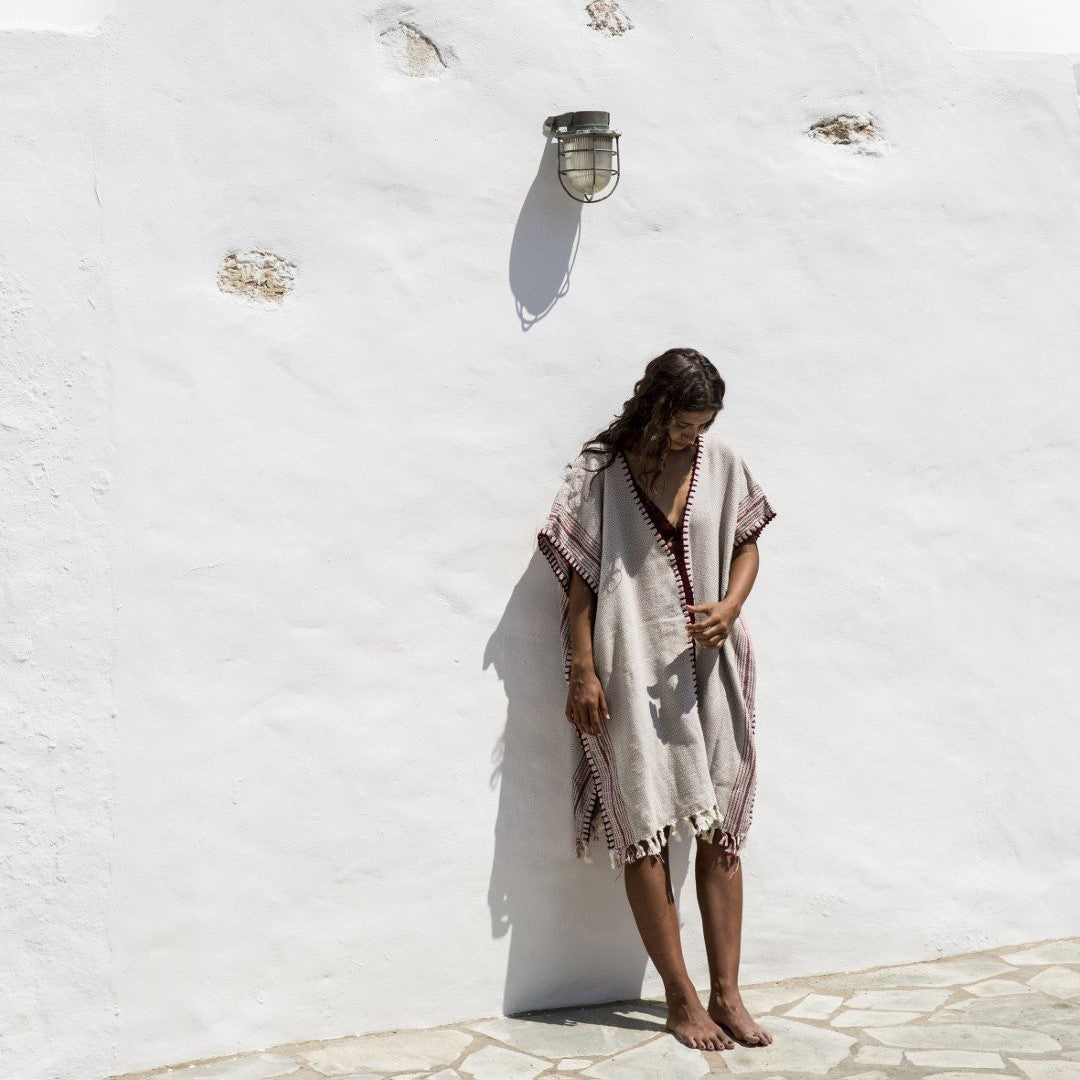 Kaftans are made out of a Turkish towel or a throw. They are loomed in Turkey, in Derya's hometown close to Izmir, by local artisans that follow the authentic traditional technique.