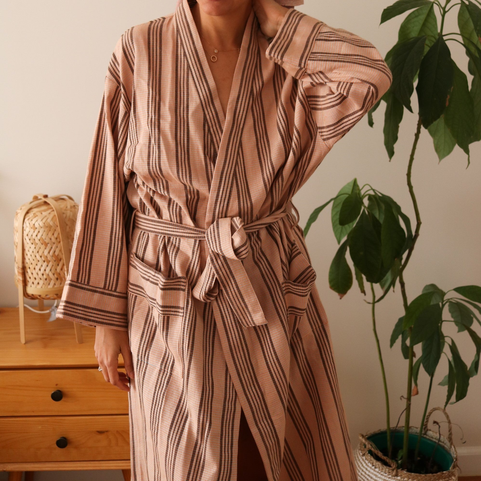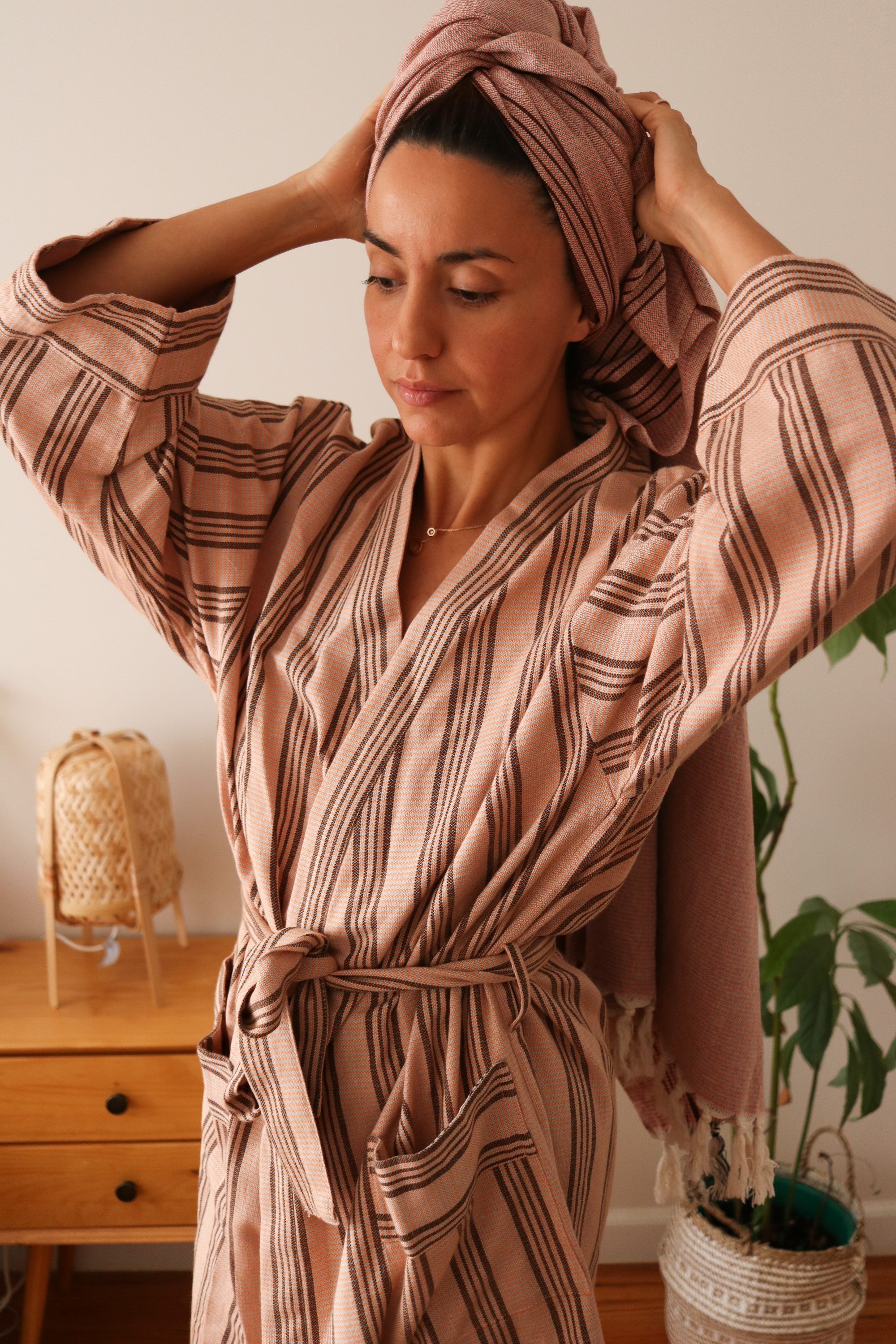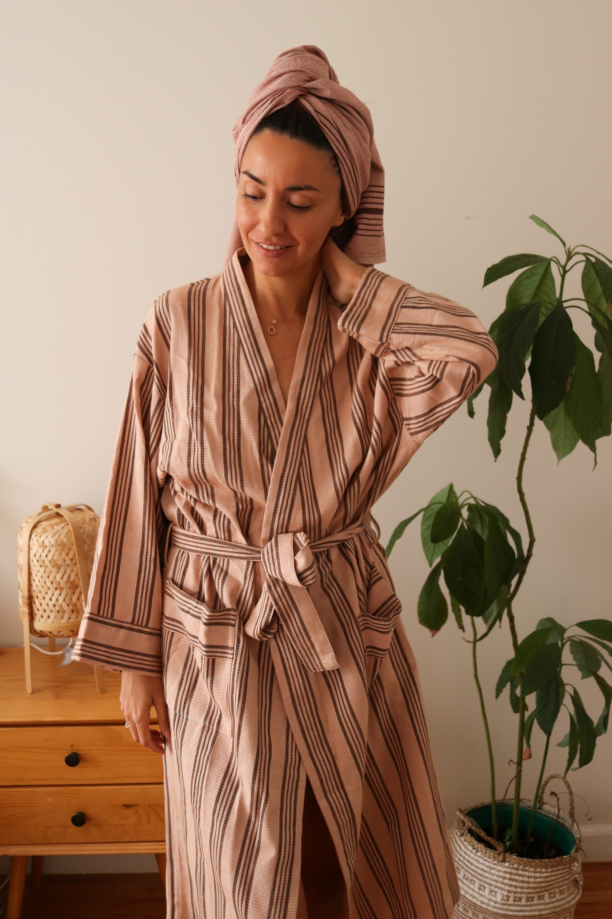 Relax at home wearing this beautiful robe. We use it right out of the shower: It's the lightweight fast-drying robe you always wanted. It's cozy to wear at home every day, while some of our customers can pull off wearing it as a summer trench coat.