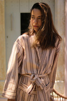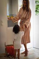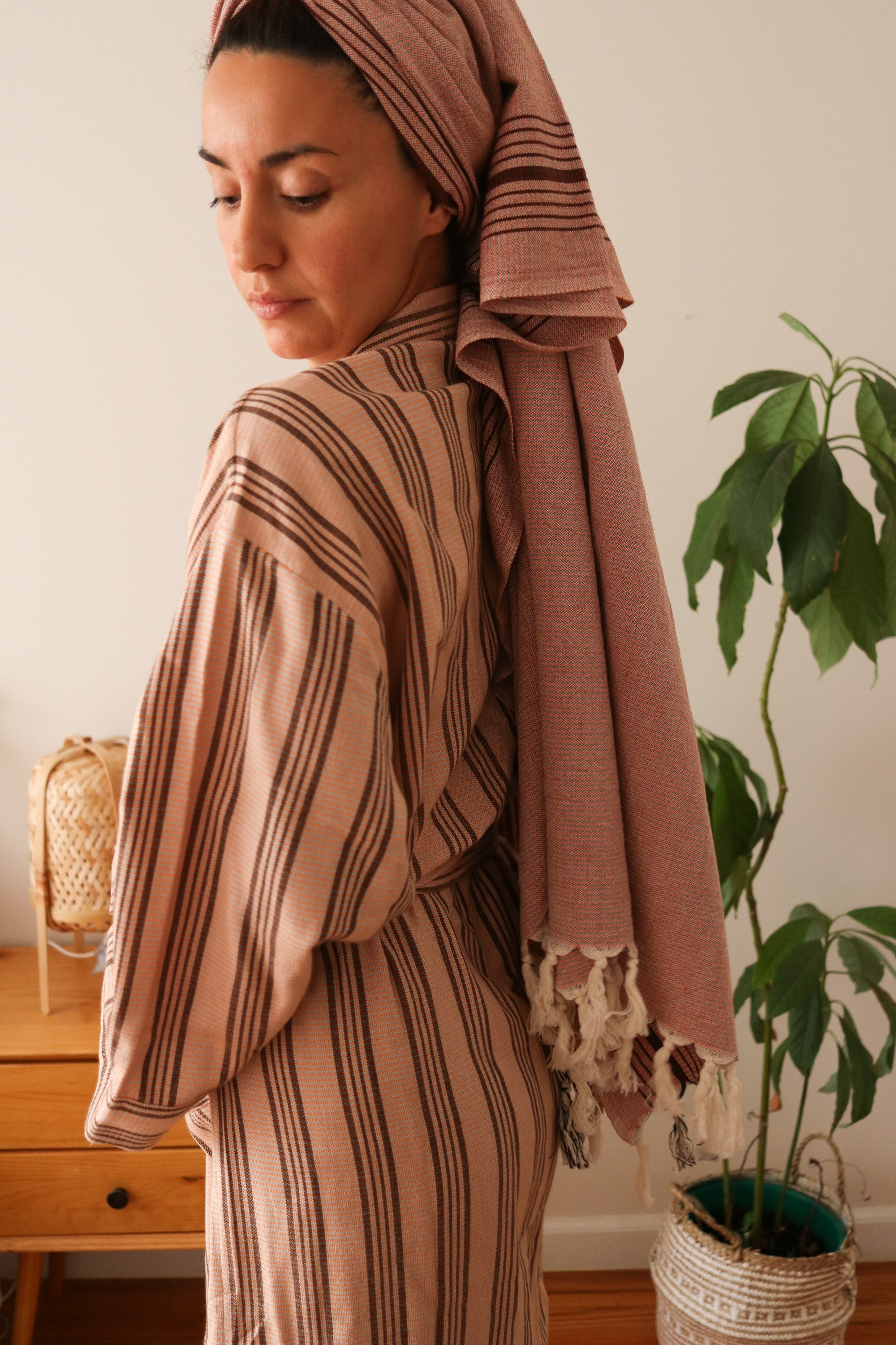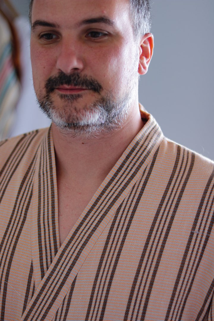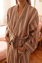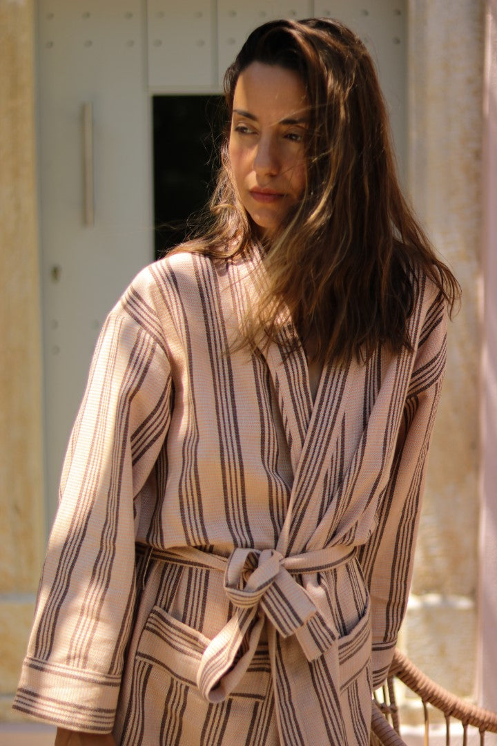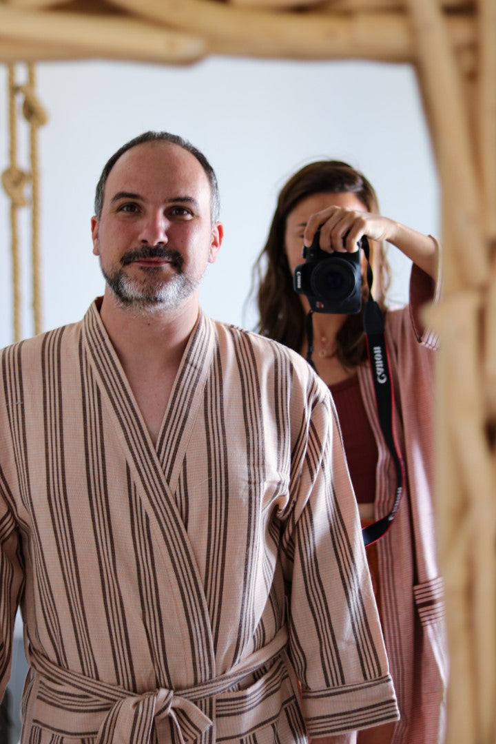 Relax at home wearing this beautiful robe. We use it right out of the shower: It's the lightweight fast-drying robe you always wanted. It's cozy to wear at home every day, while some of our customers can pull off wearing it as a summer trench coat.