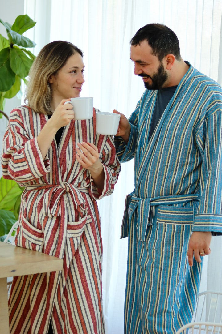 Made out of our Turkish towel material, they always smell fresh, even in the most humid environments. As a bathrobe, they are breathable so you won't overheat after the shower, and they are snag- and unravel-proof.