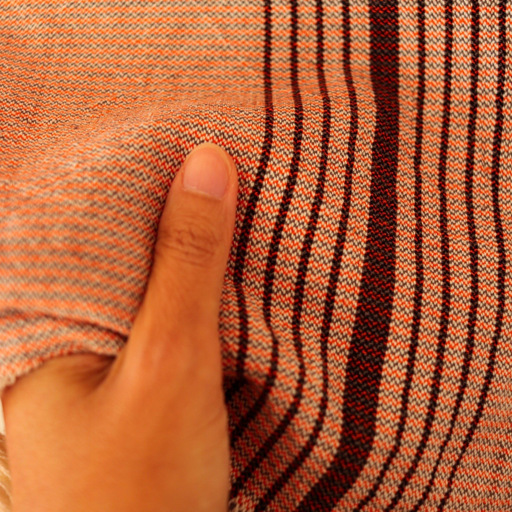 DERVISH is a classic design with a modern twist: Lengthwise it features two bands of black stripes on both sides. While the background seems like it is a solid beige, if you look closely you'll see very thin horizontal orange and gray stripes.