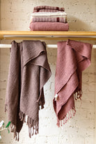 Machine wash warm or cold with similar colors. We recommend not using fabric softener in your wash. Fabric softener smells great but actually coats the fibers making them less absorbent. No bleach and try not to mix the wash with items that have zippers or hooks as they might get tangled in the fringes.