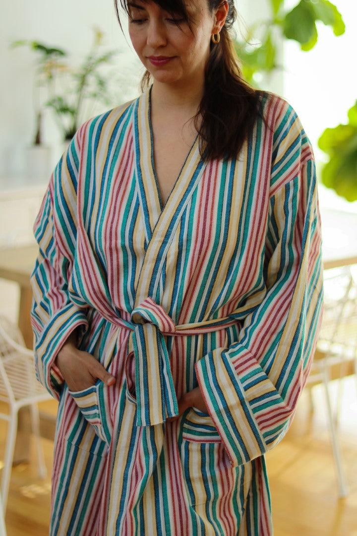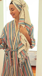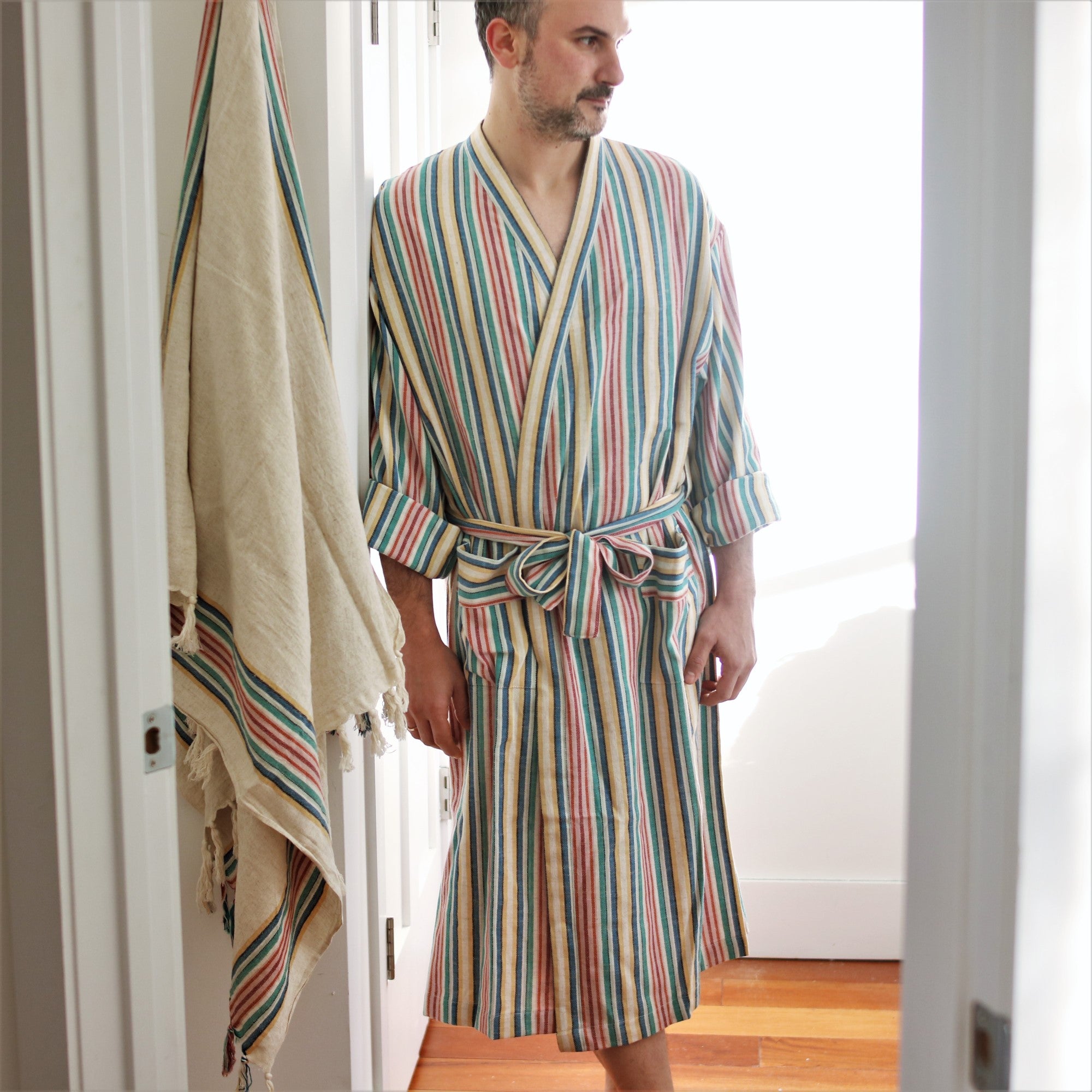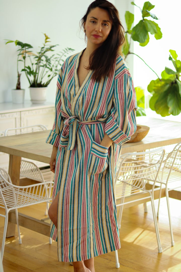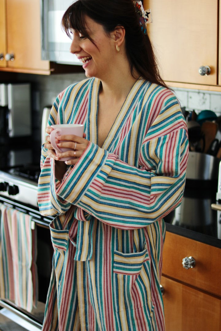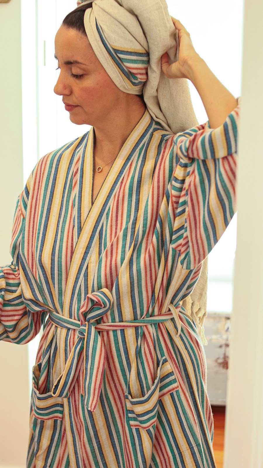 Relax at home wearing this beautiful robe featuring all our Anatolico colors. We use it right out of the shower: It's the lightweight fast-drying robe you always wanted. It's cozy to wear at home every day, while some of our customers can pull off wearing it as a summer trench coat.