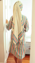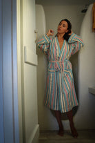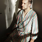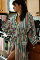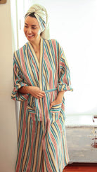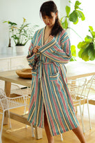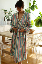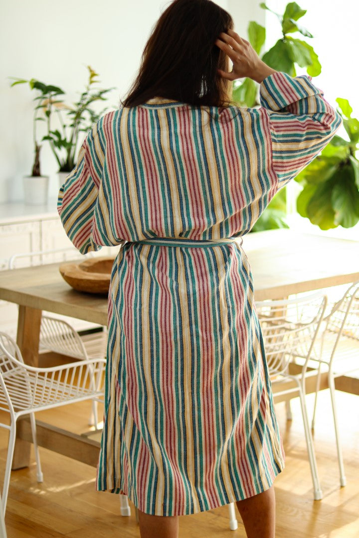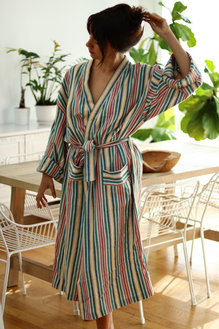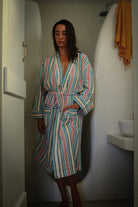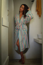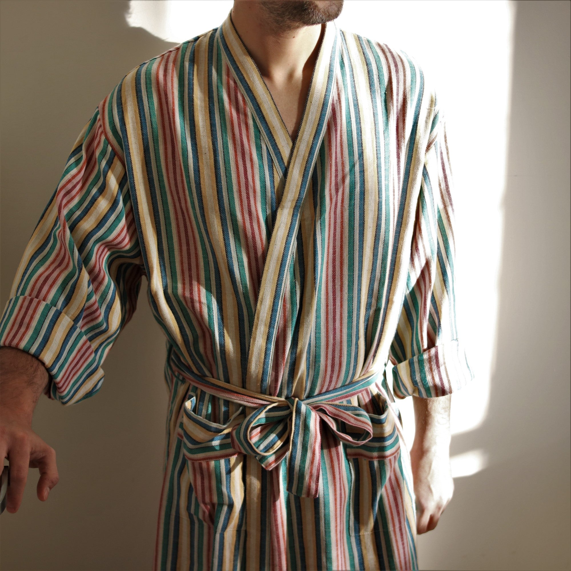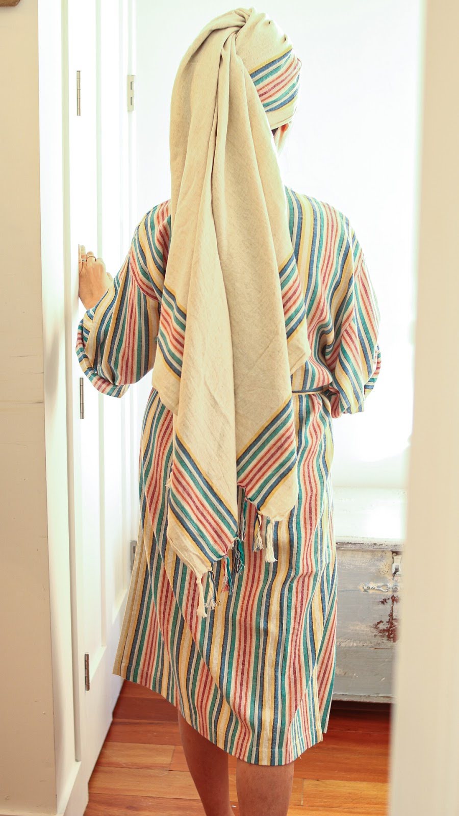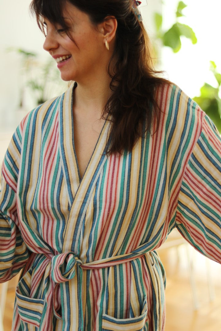 Relax at home wearing this beautiful robe featuring all our Anatolico colors. We use it right out of the shower: It's the lightweight fast-drying robe you always wanted. It's cozy to wear at home every day, while some of our customers can pull off wearing it as a summer trench coat.
