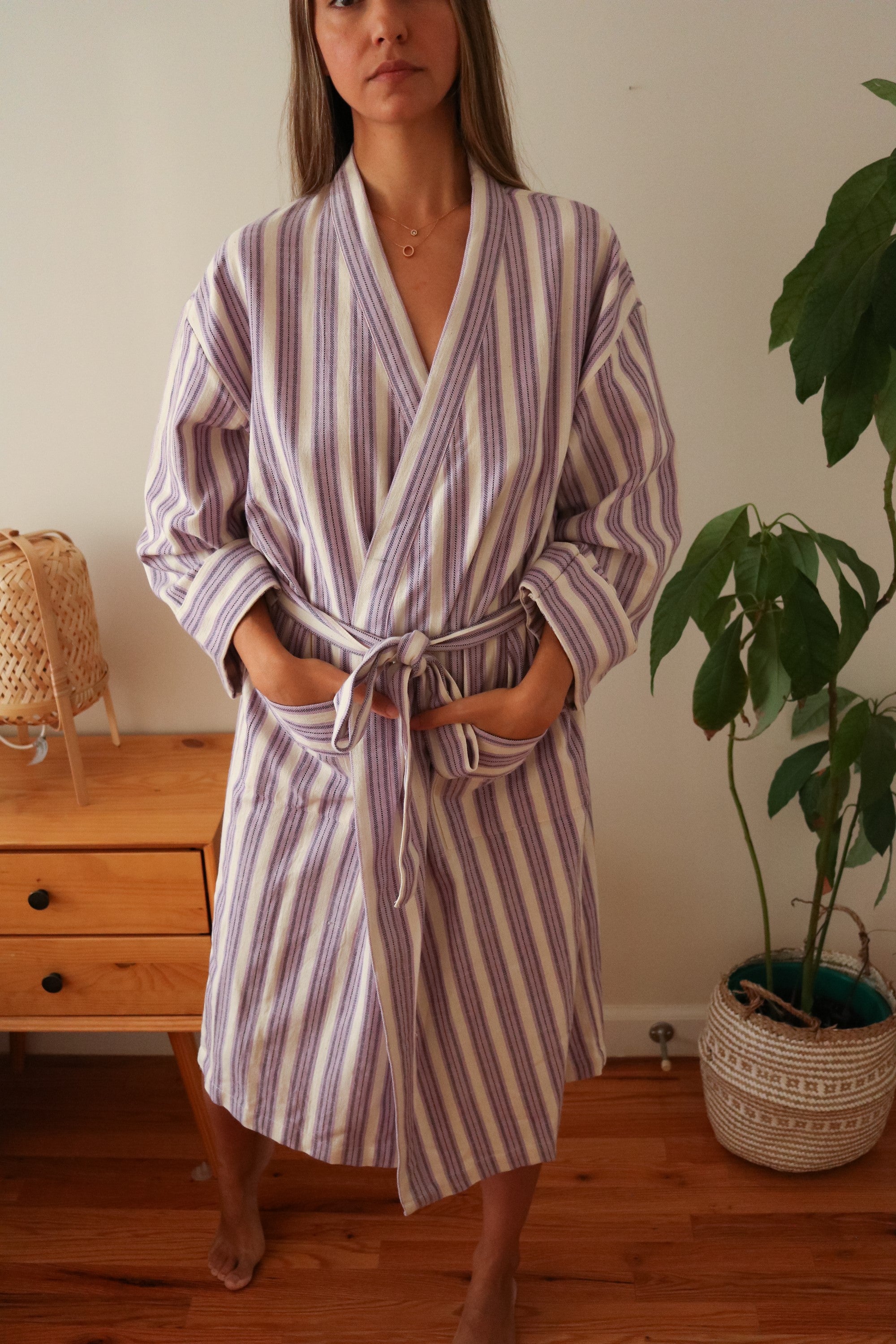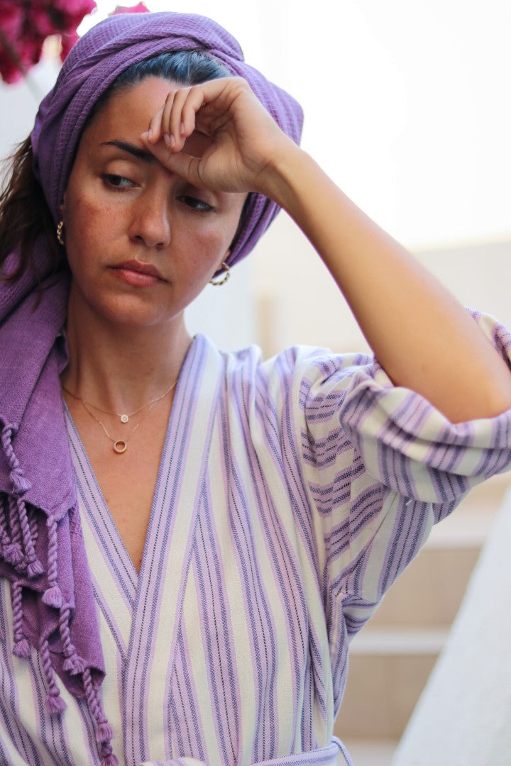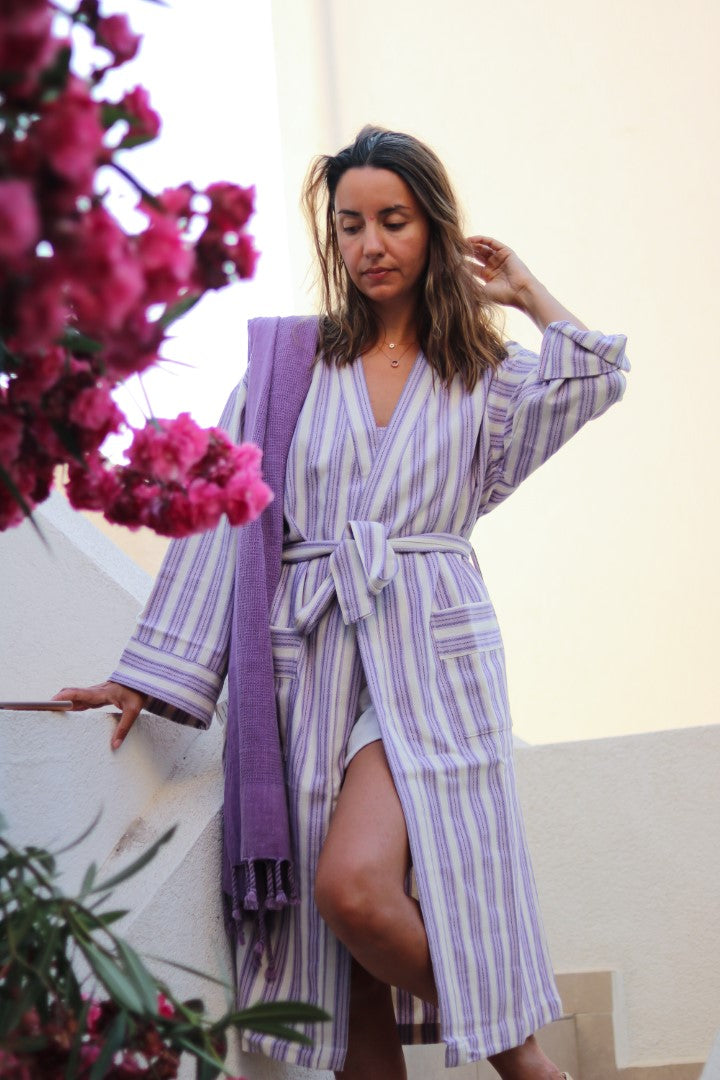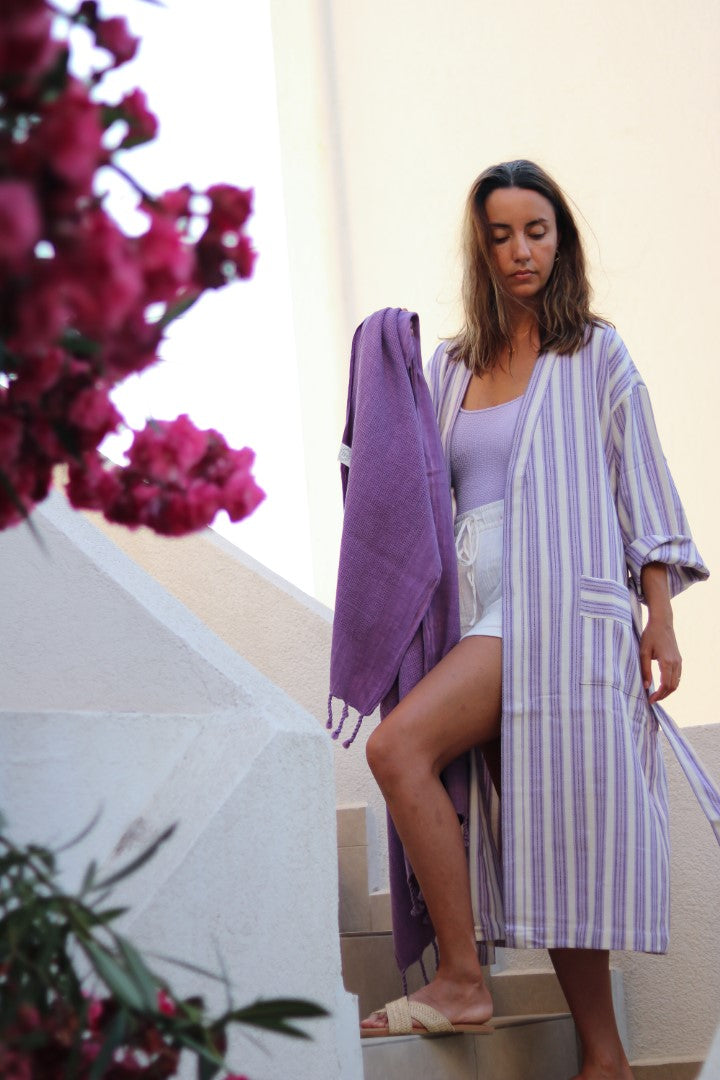 Relax at home wearing this beautiful Anatolico robe featuring purple stripes. We use it right out of the shower: It's the lightweight fast-drying robe you always wanted. It's cozy to wear at home every day, while some of our customers can pull off wearing it as a summer trench coat.