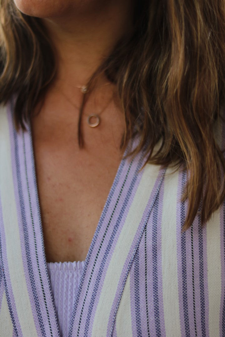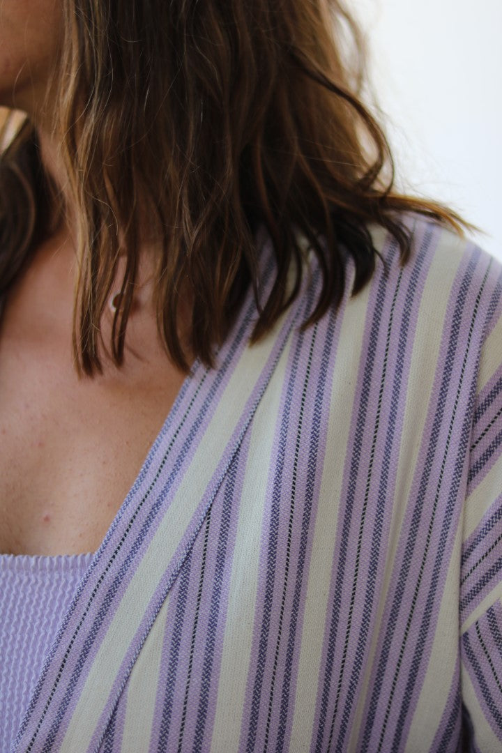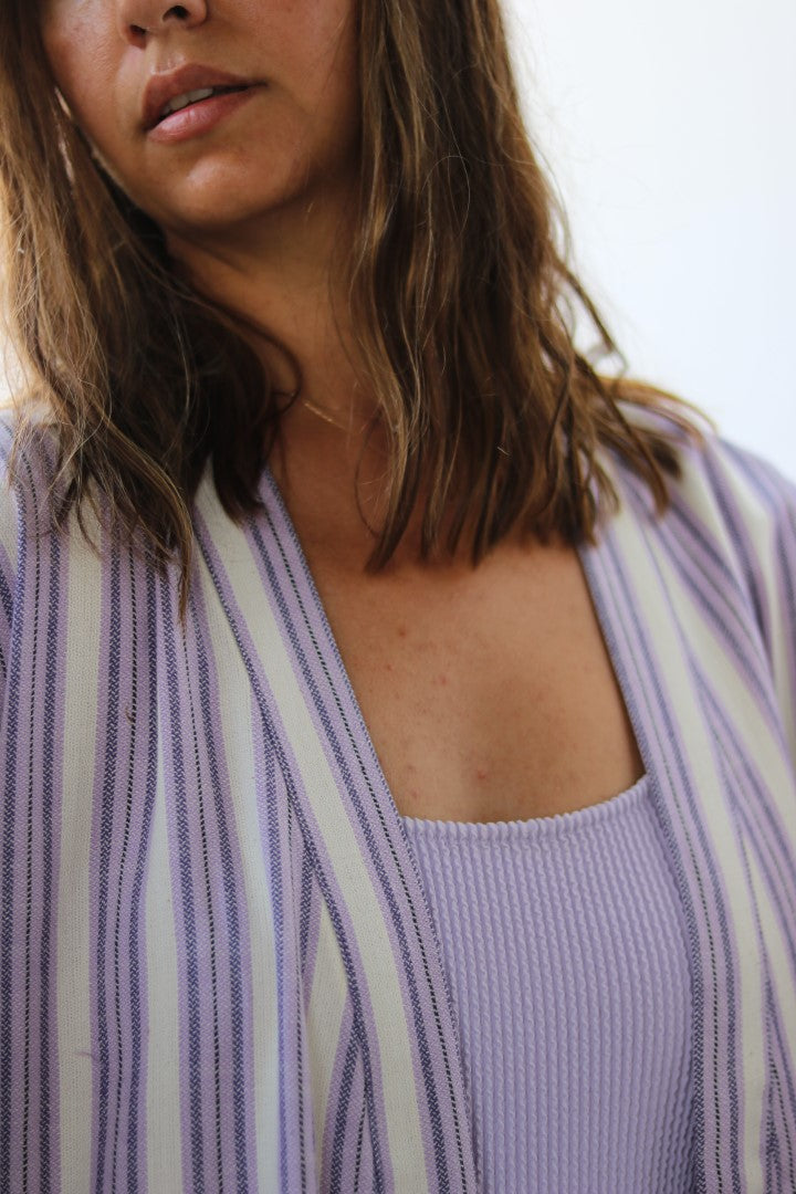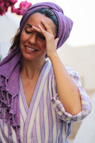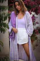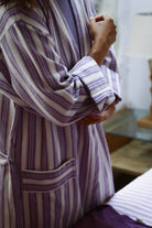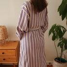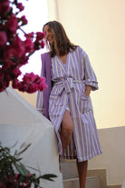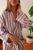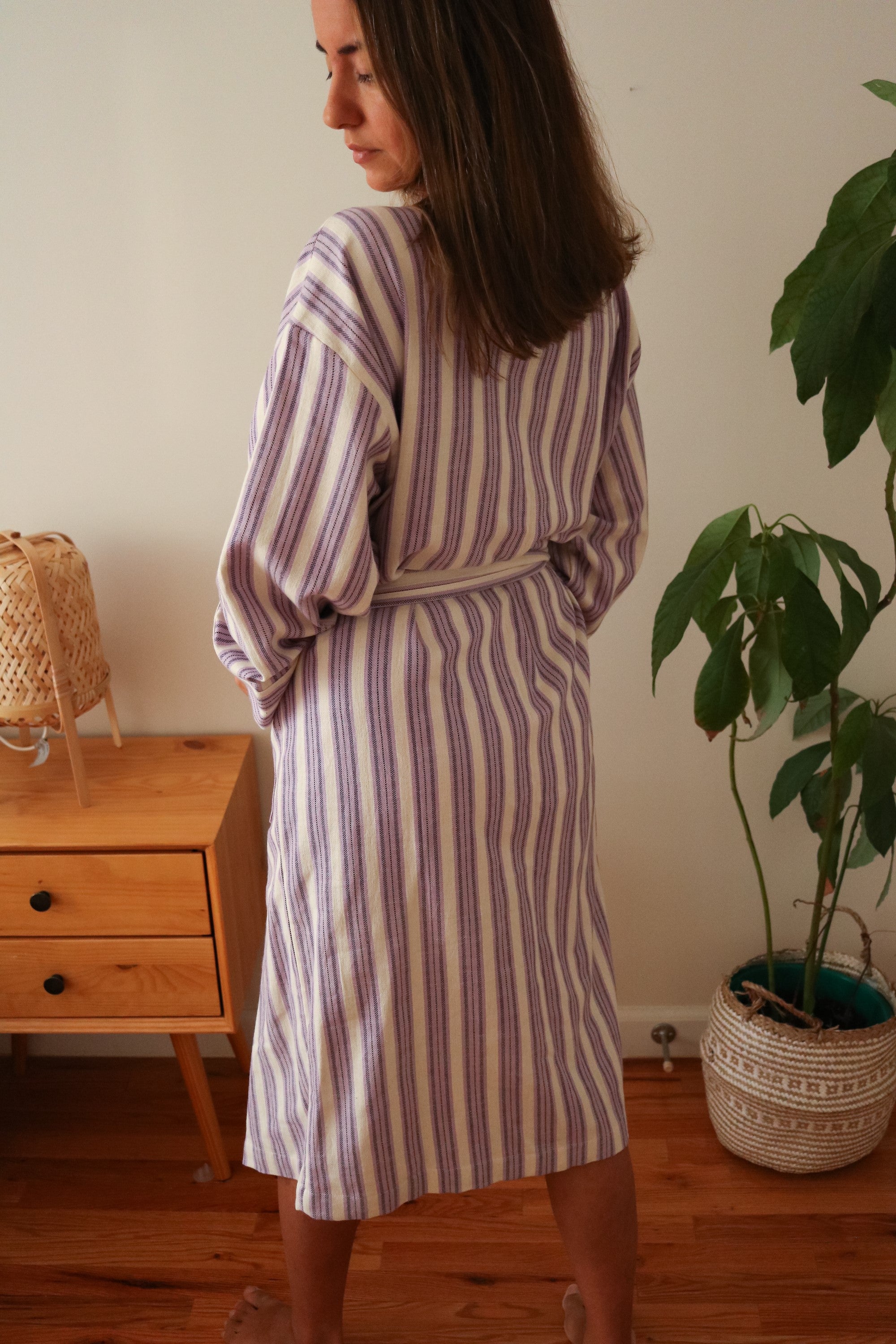 Relax at home wearing this beautiful Anatolico robe featuring purple stripes. We use it right out of the shower: It's the lightweight fast-drying robe you always wanted. It's cozy to wear at home every day, while some of our customers can pull off wearing it as a summer trench coat.
