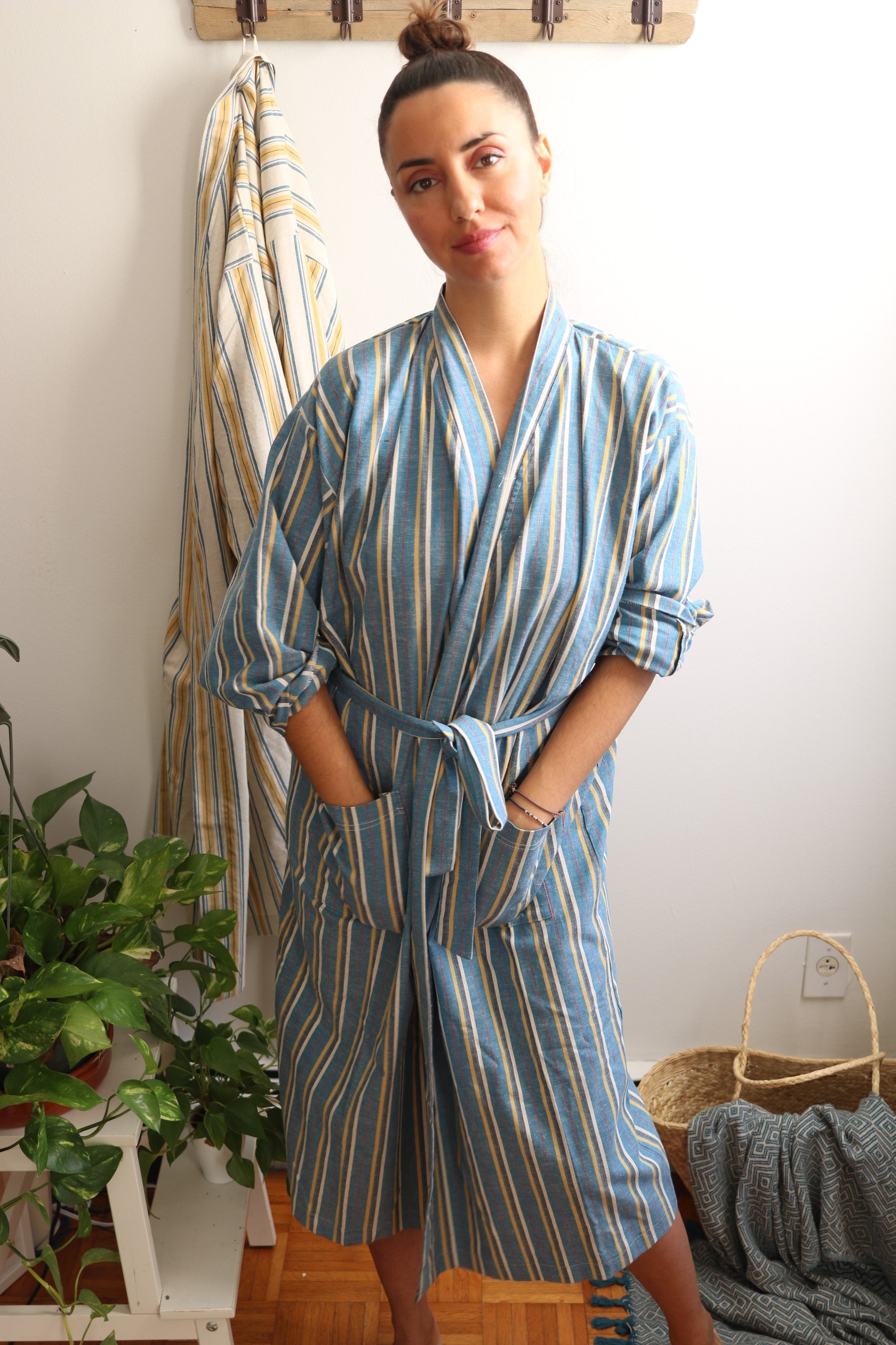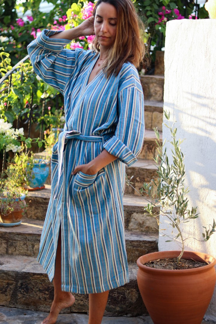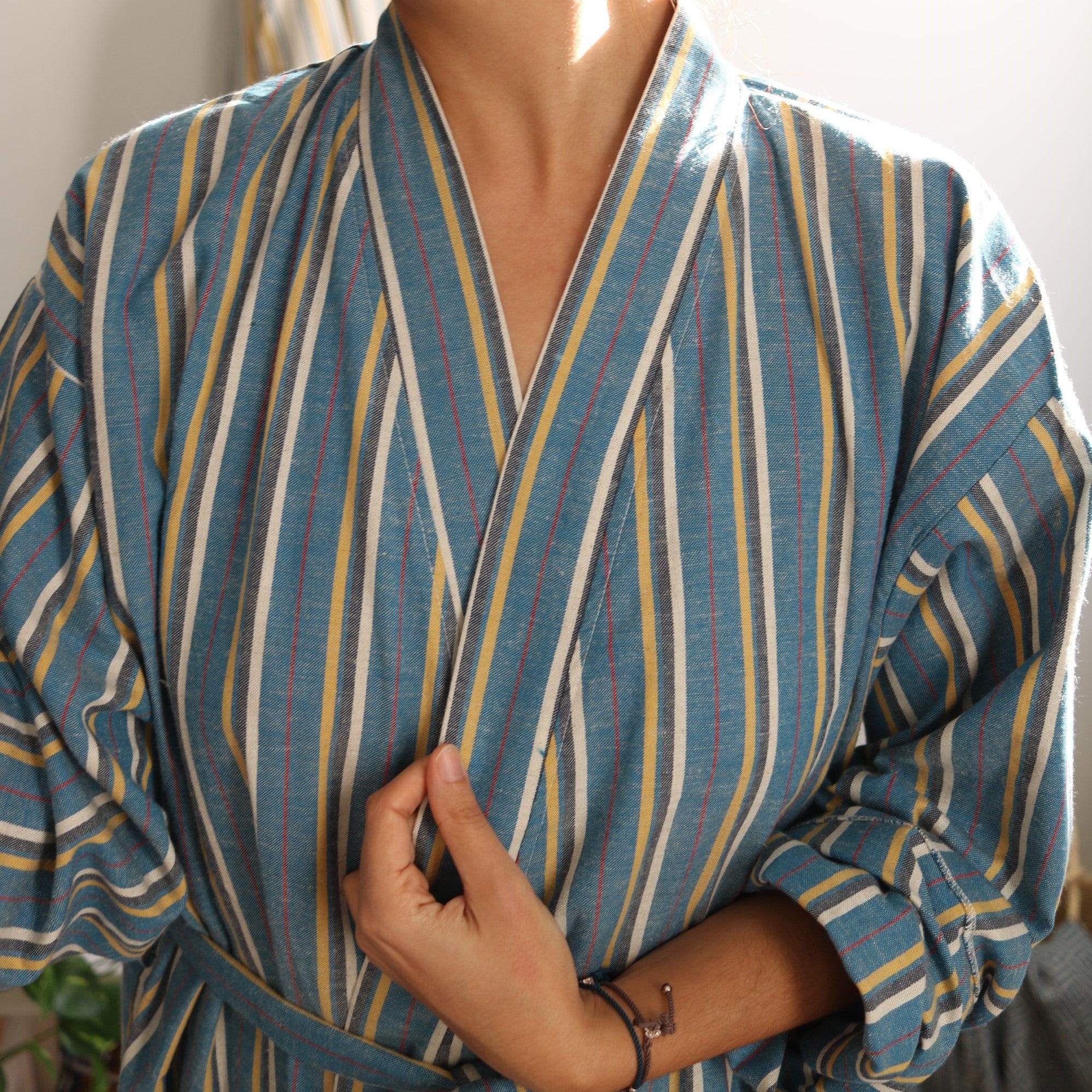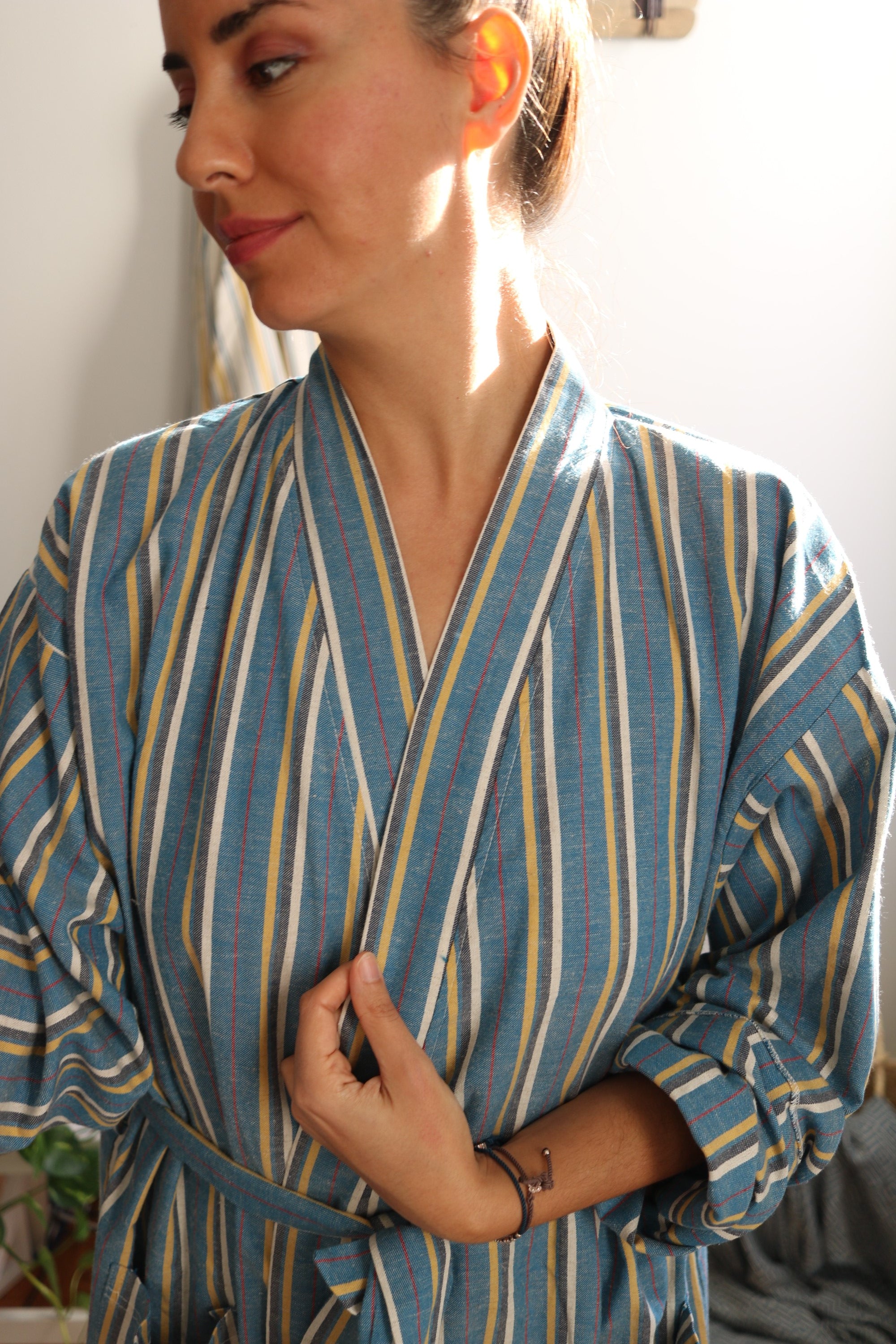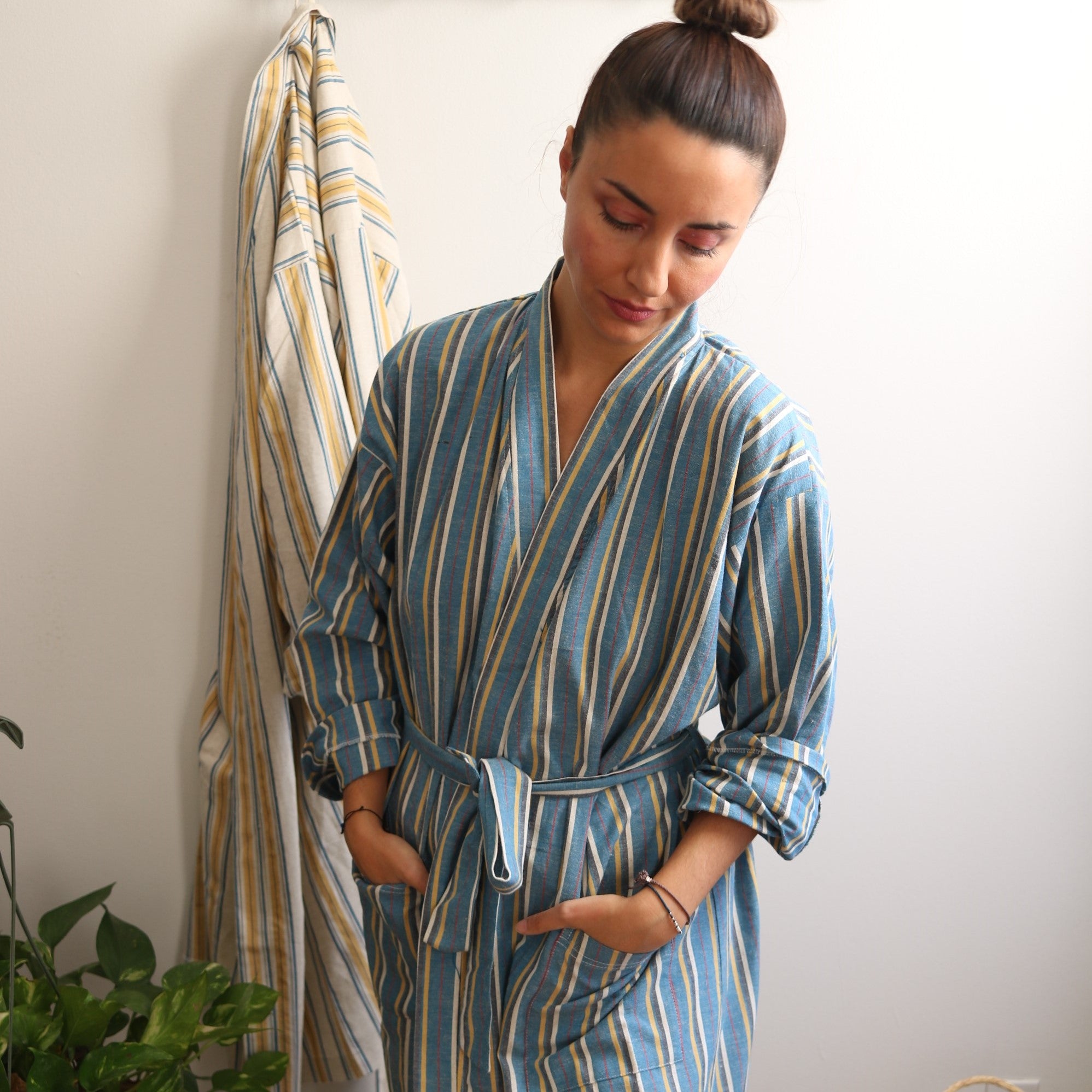Relax at home wearing this beautiful robe featuring bold blue stripes. We use it right out of the shower: It's the lightweight fast-drying robe you always wanted. It's cozy to wear at home every day, while some of our customers can pull off wearing it as a summer trench coat.