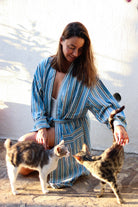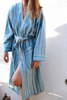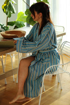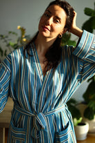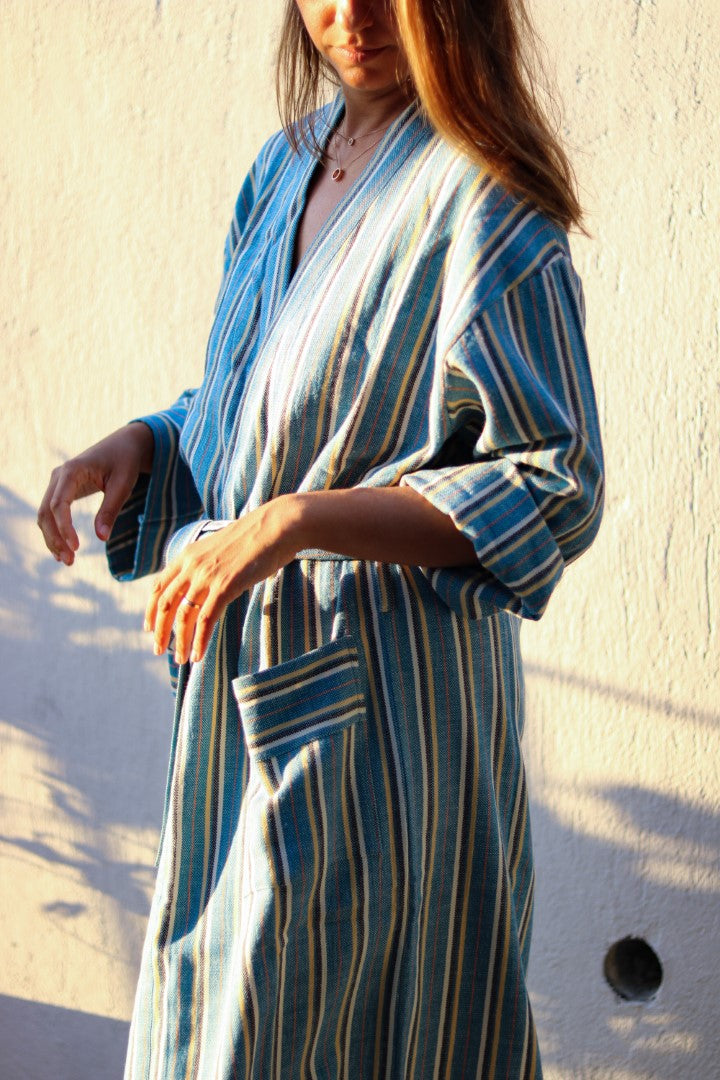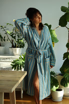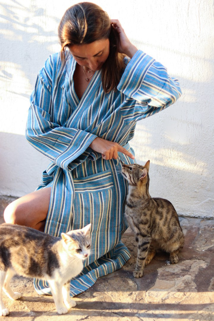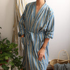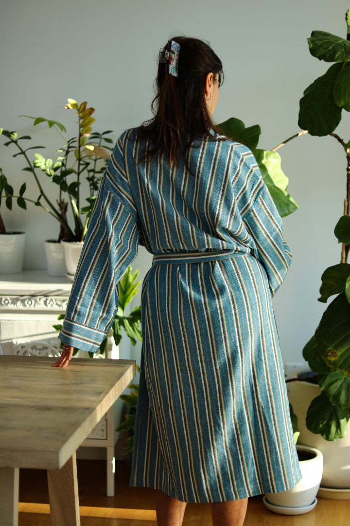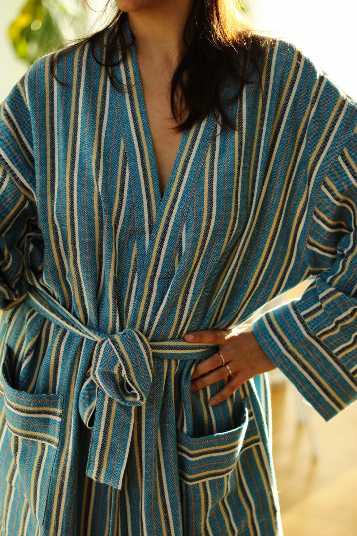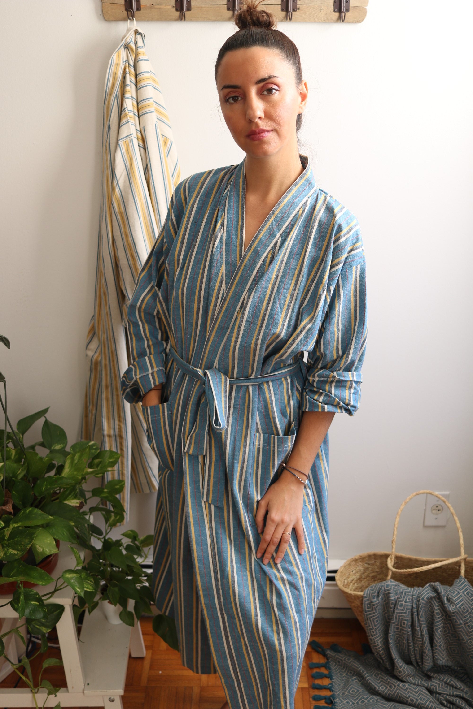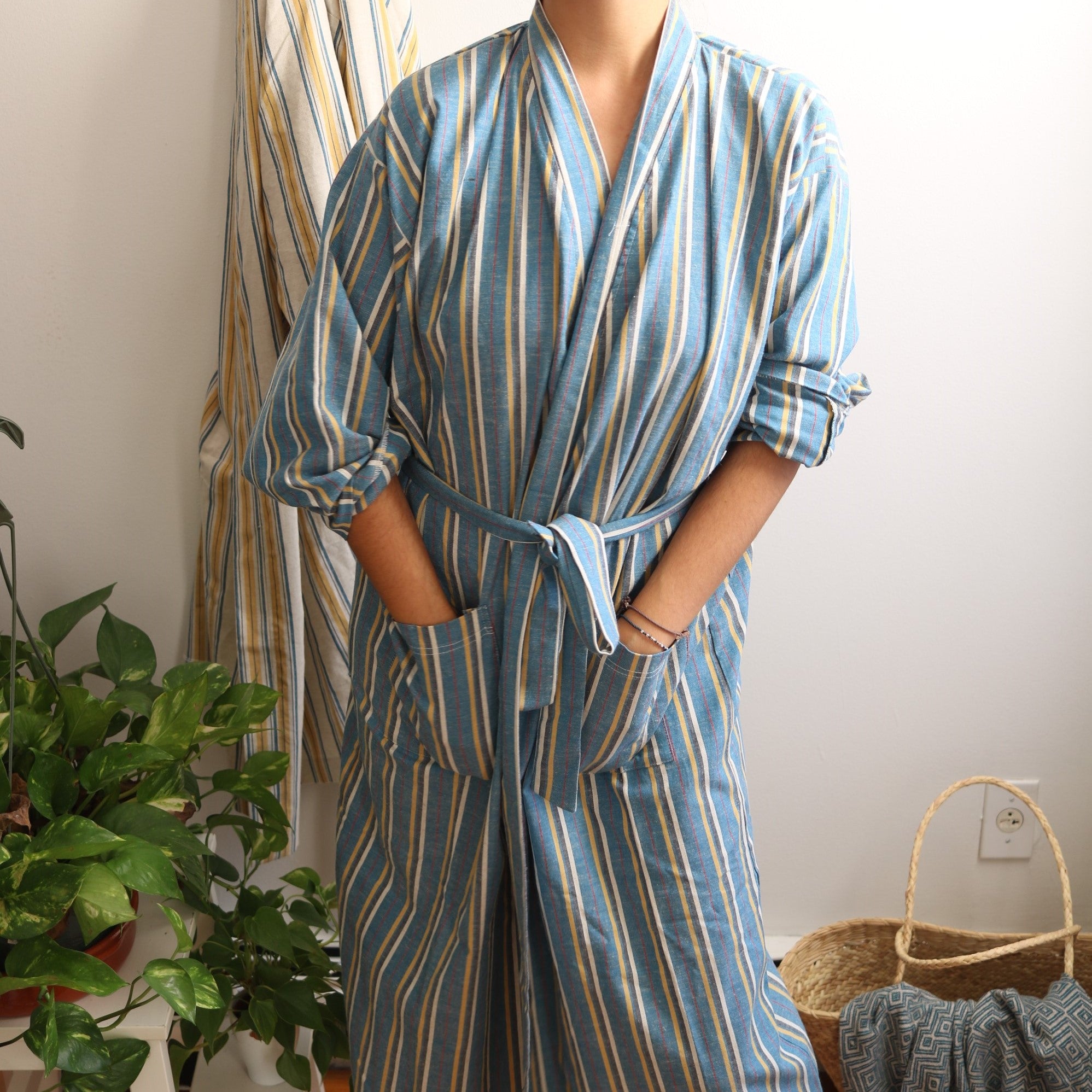 Relax at home wearing this beautiful robe featuring bold blue stripes. We use it right out of the shower: It's the lightweight fast-drying robe you always wanted. It's cozy to wear at home every day, while some of our customers can pull off wearing it as a summer trench coat.