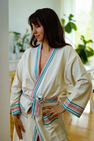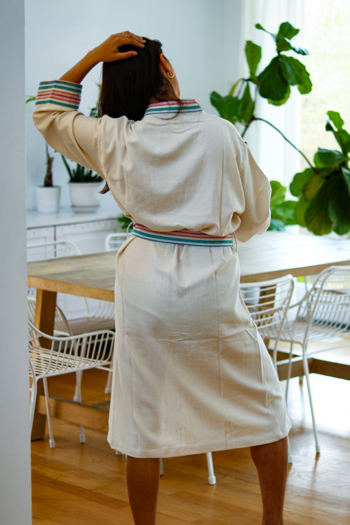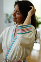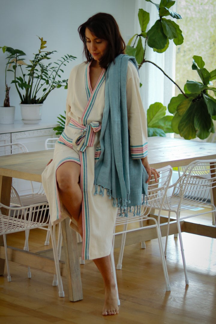 Relax at home wearing this beautiful robe featuring a band of all the Anatolico colors. We use it right out of the shower: It's the lightweight fast-drying robe you always wanted. It's cozy to wear at home every day, while some of our customers can pull off wearing it as a summer trench coat.
