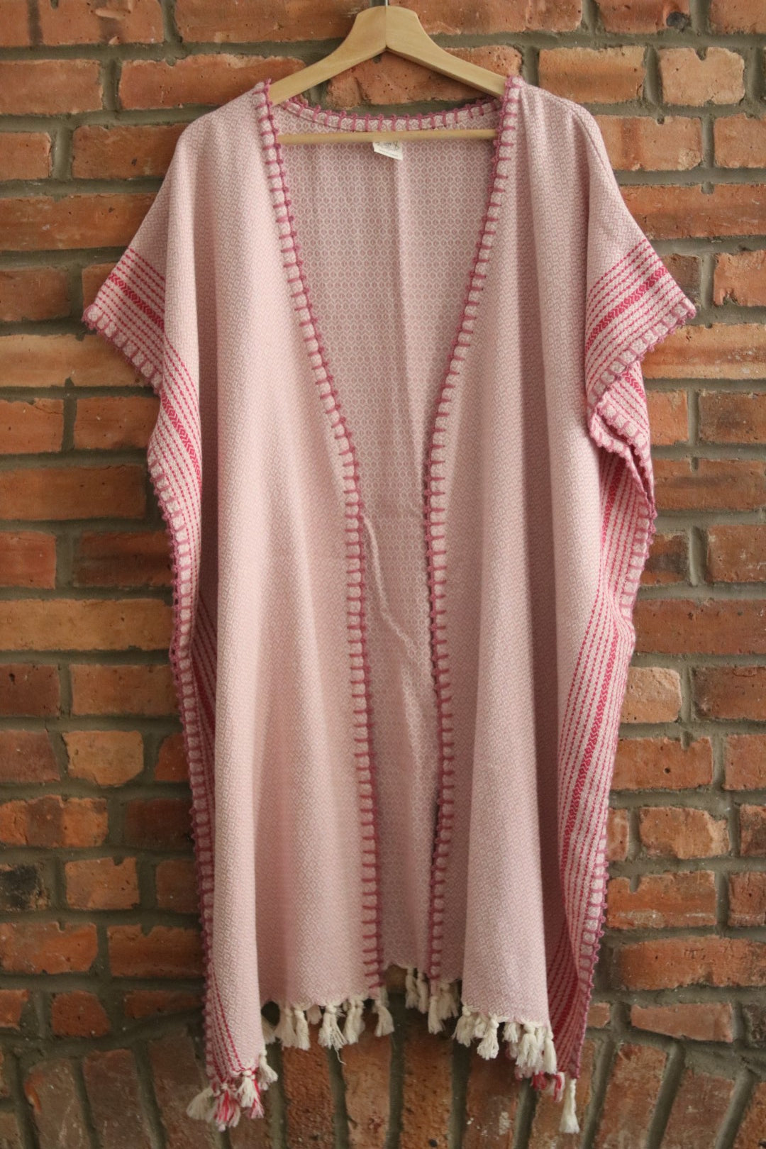 Open or stitched down the front with beautiful stitching all around. A modern spin on the classic Turkish towel makes it the perfect item for you to wear on the beach, on spring or fall evenings over something simple, or while relaxing at home.