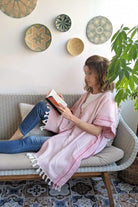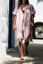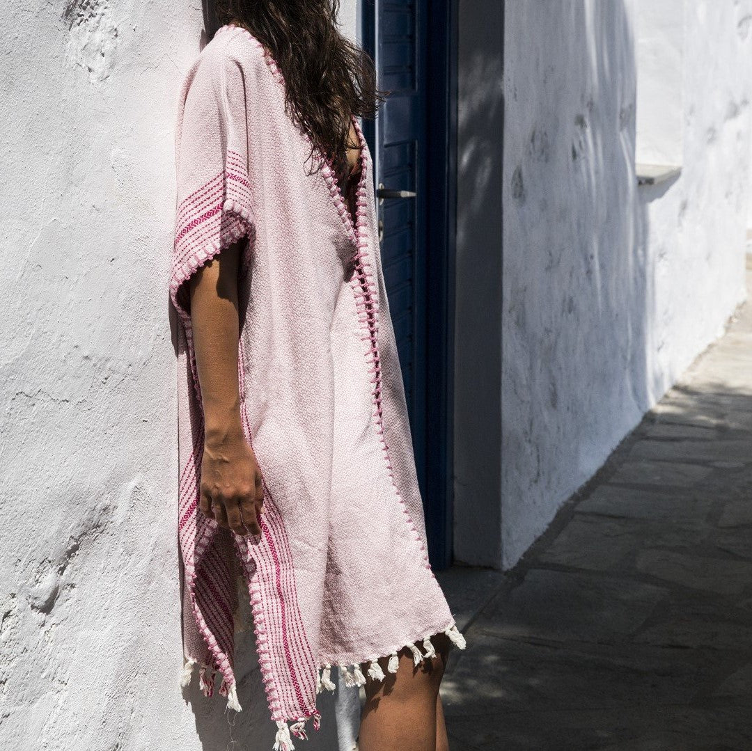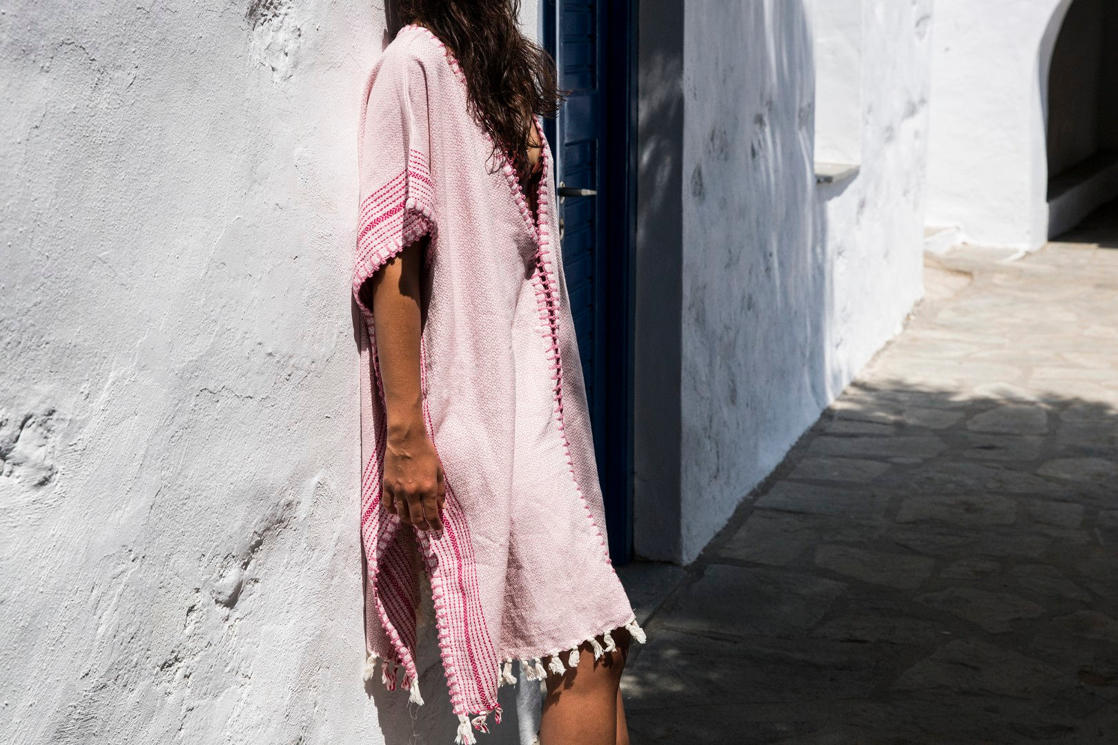 Kaftans are made out of a Turkish towel or a throw. They are loomed in Turkey, in Derya's hometown close to Izmir, by local artisans that follow the authentic traditional technique.